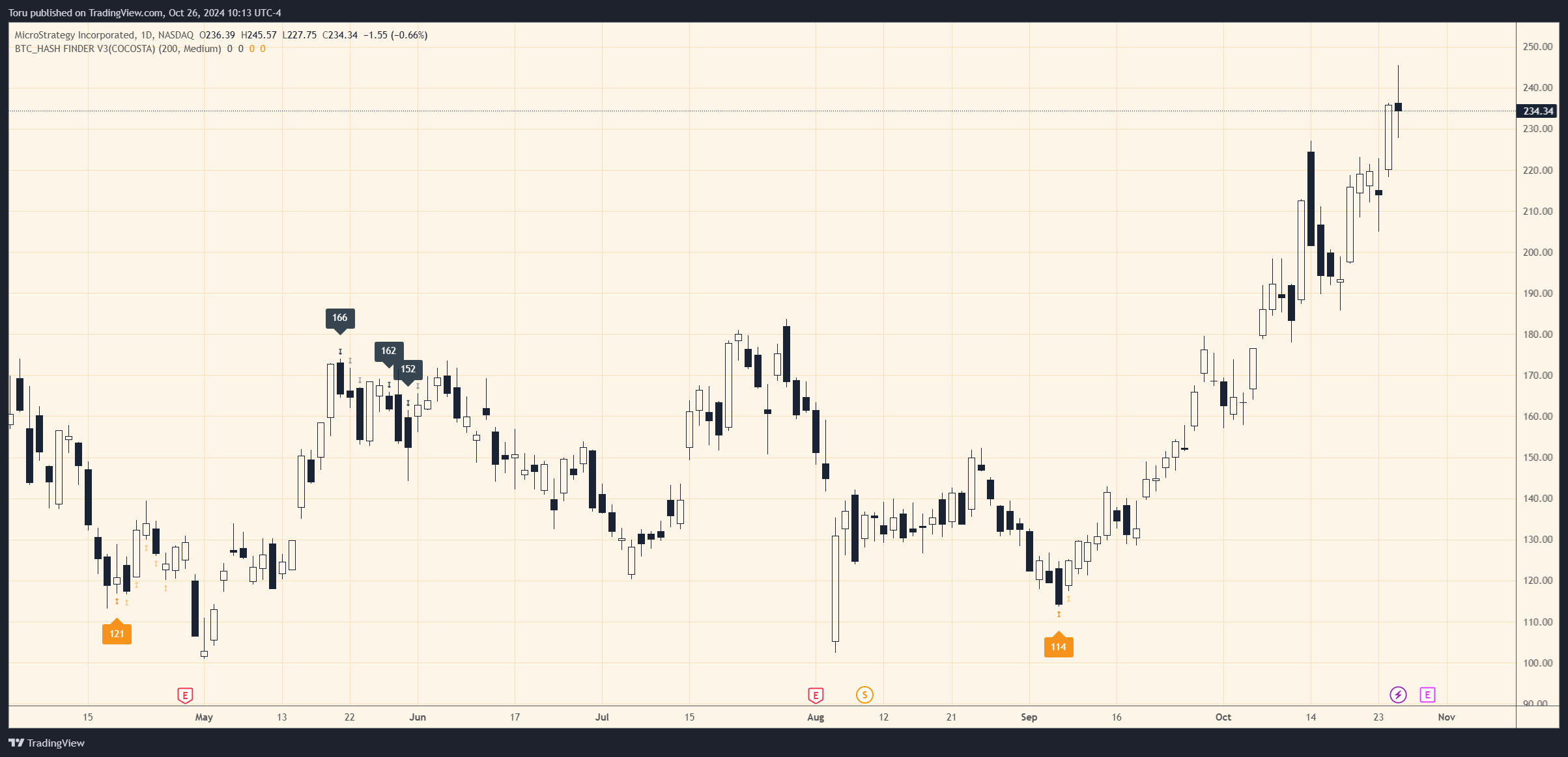 2024年9月6日、ハッシュファインダーがマイクロストラテジー株114ドル付近で買いシグナルを点灯。その後、株価は234ドルまで上昇し、なんと約105%のリターンを記録中です。しかも、この上昇はまだ続いている最中なんです!