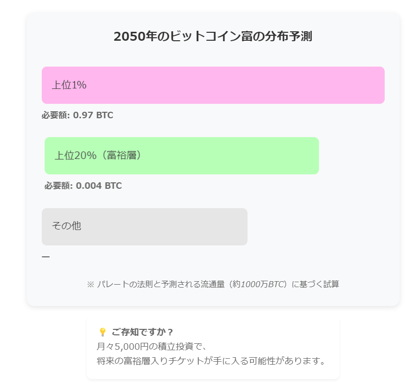 つまり、毎月5,000円程度(0.004 BTC)の積立投資でも、将来の富裕層入りのチケットが手に入る計算になるんです。