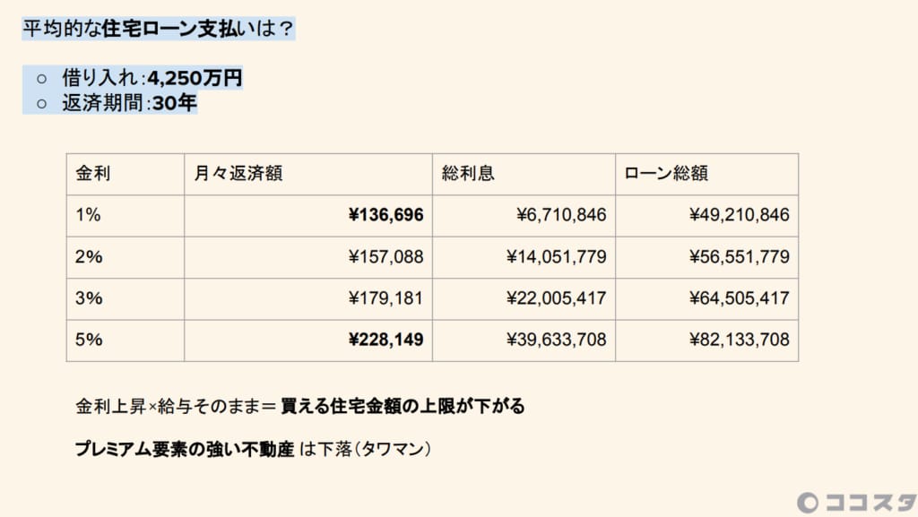 ↑ 仮に住宅ローン金利が5%などに上昇した場合、変動金利ローンを保有している人は返済金額の全額が利払いのみに充てられ、元本は返済されない事態となる可能性があります。またプレミアム要素の強い不動産物件は下落が見込まれます。