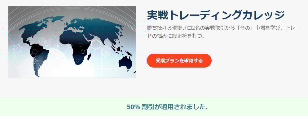 ↑ 実戦トレーディングカレッジが初月半額で受講できるクーポンはこちら(予告なく終了となる点をご了承ください)
