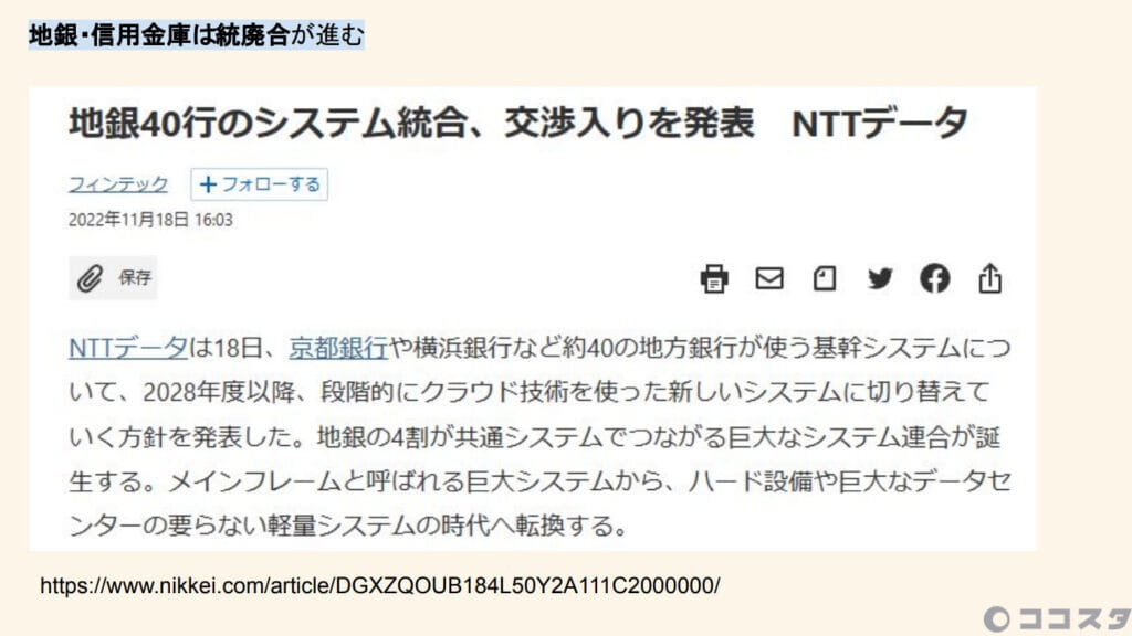 ↑ 地銀・信用金庫の統合に向けては、すでに2022年からシステムの統廃合が進んでいます