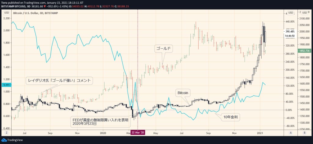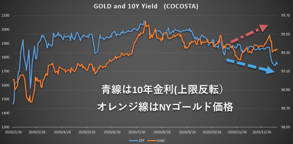 2020年11月末からの動きを見ると、ゴールドが上昇しつつも金利は下げていない(水色グラフが下降)ことが分かります。