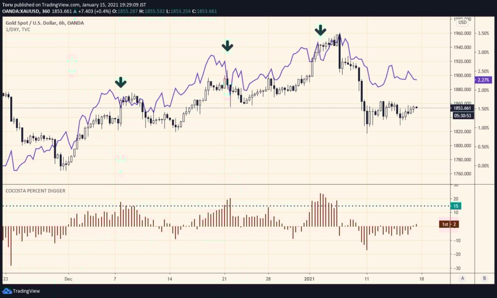 下のチャートではゴールドとドルインデックスの関係を分かりやすくするため、後者を上下反転して配置してみました。