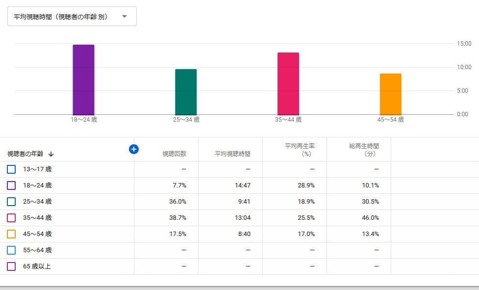 視聴回数では35歳から44歳。視聴時間では18歳~24歳が最大となってます。