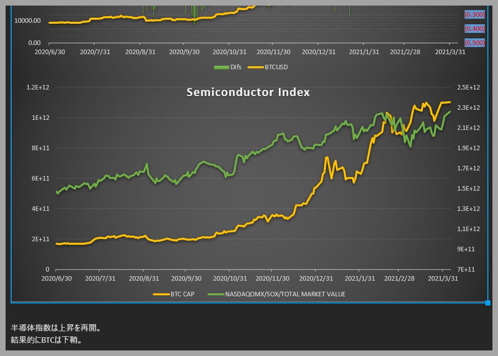 ビットコイン(黄色線)と半導体指数(緑)の比較 (クリプト通信4月7日配信分から)