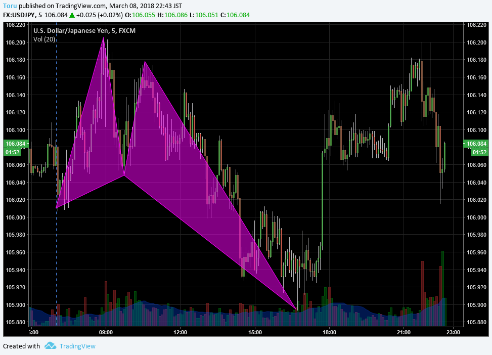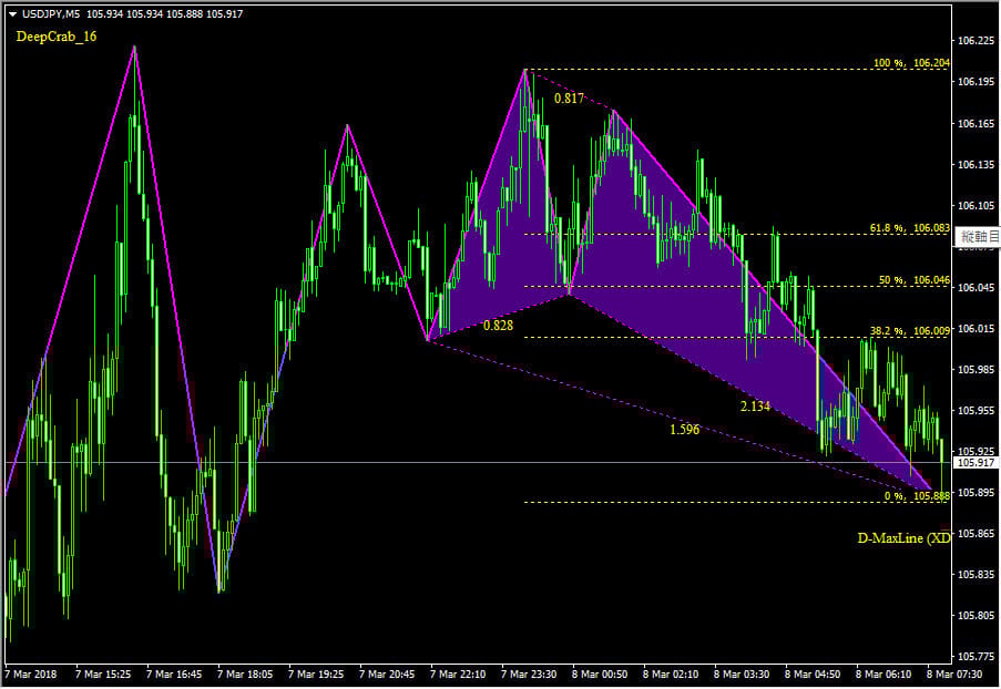 16時45分、ドル円に完成した高精度ハーモニック。MT4自動検知ツールが描画した5分足の様子。
