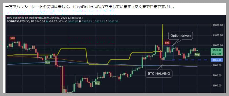 またHashFinderで「買い」が点灯しているのは、ハッシュレートの急回復が理由との考察も。
